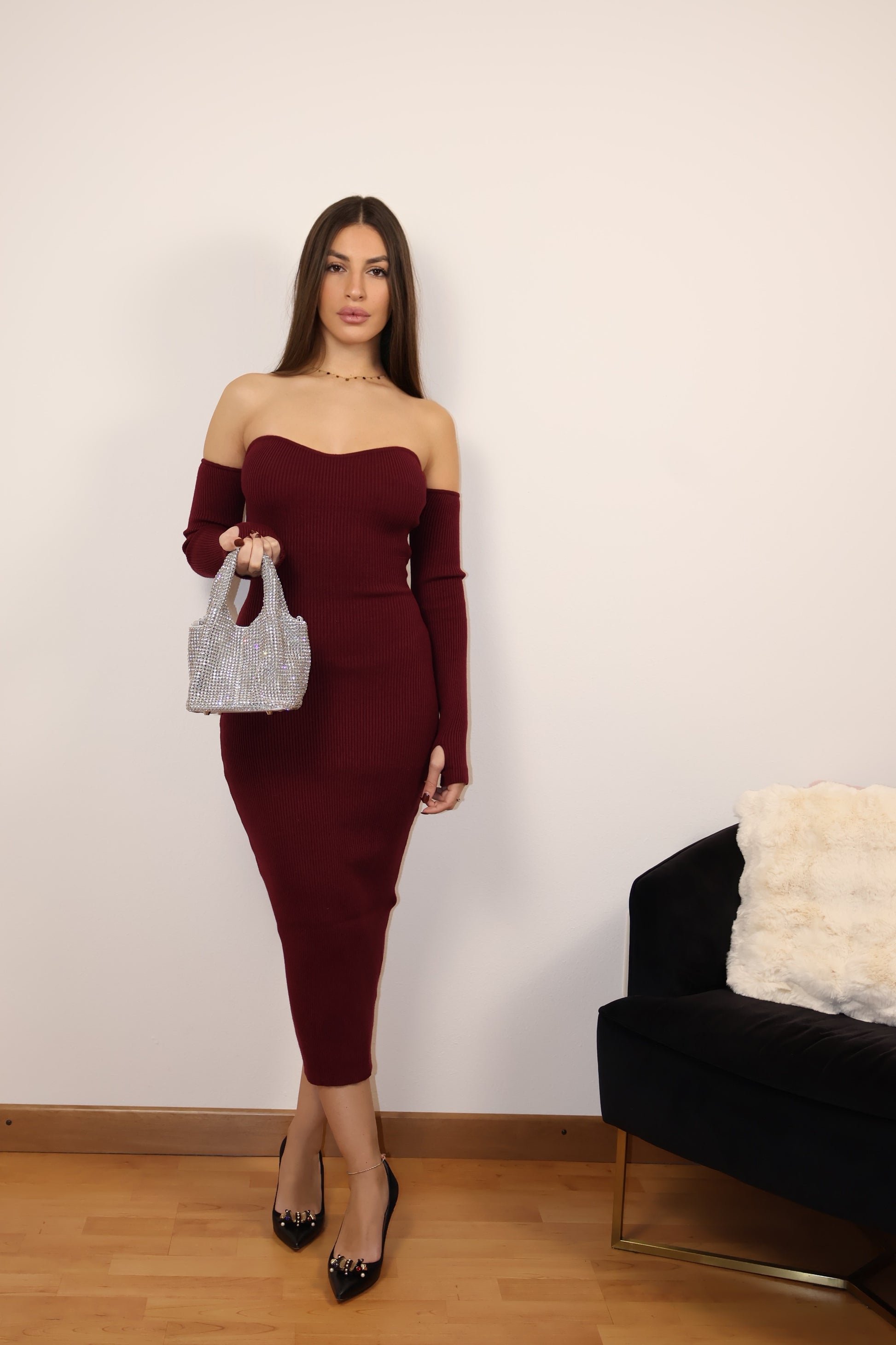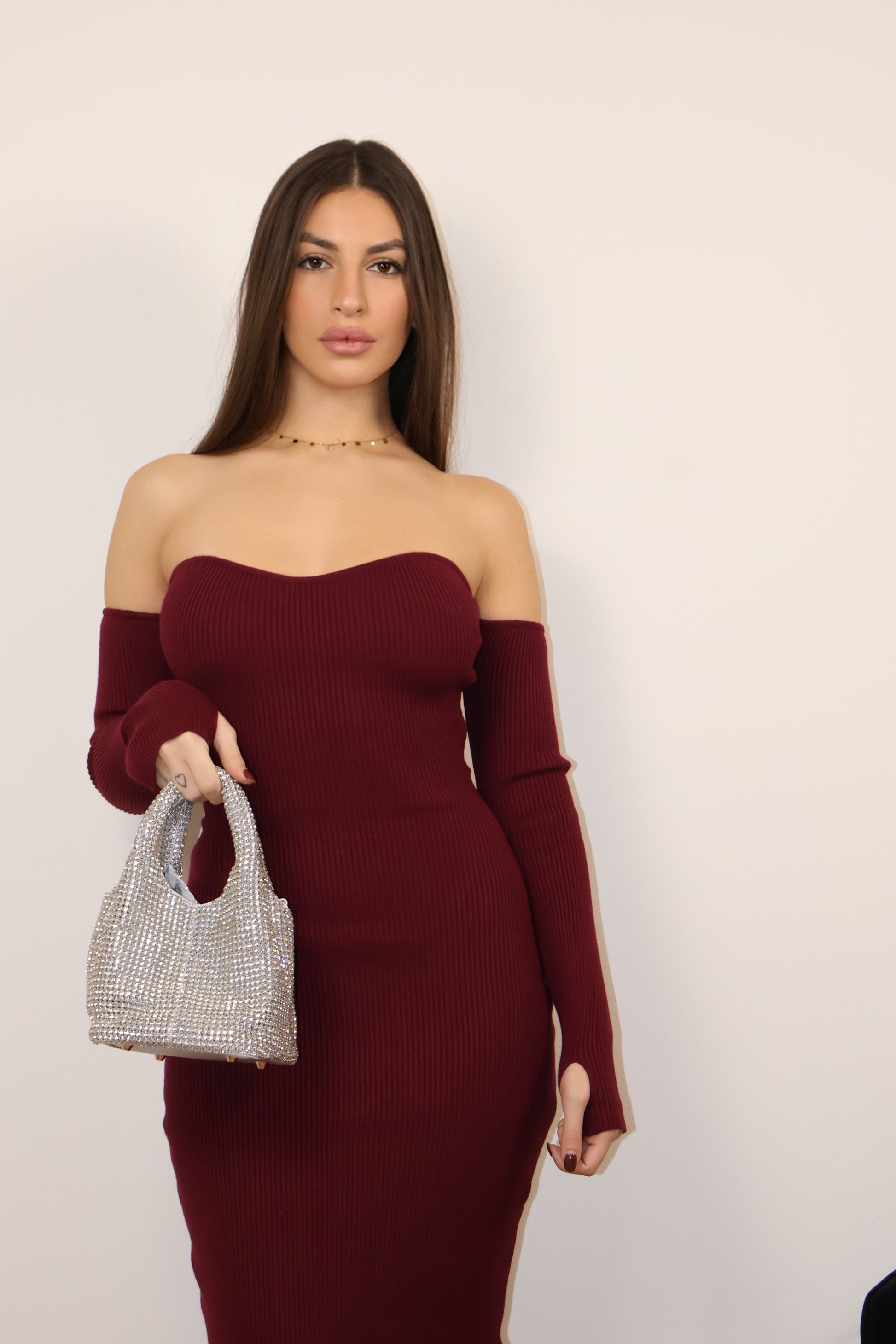 L’abito Miranda è un modello in maglia dal fascino sensuale ed essenziale. La sua linea aderente valorizza le forme senza rinunciare al comfort, mentre la scollatura a cuore off-the-shoulder aggiunge un tocco irresistibilmente femminile. Le maniche lunghe con dettaglio thumb-hole donano modernità e carattere, rendendolo ideale per una serata speciale o un’occasione elegante.