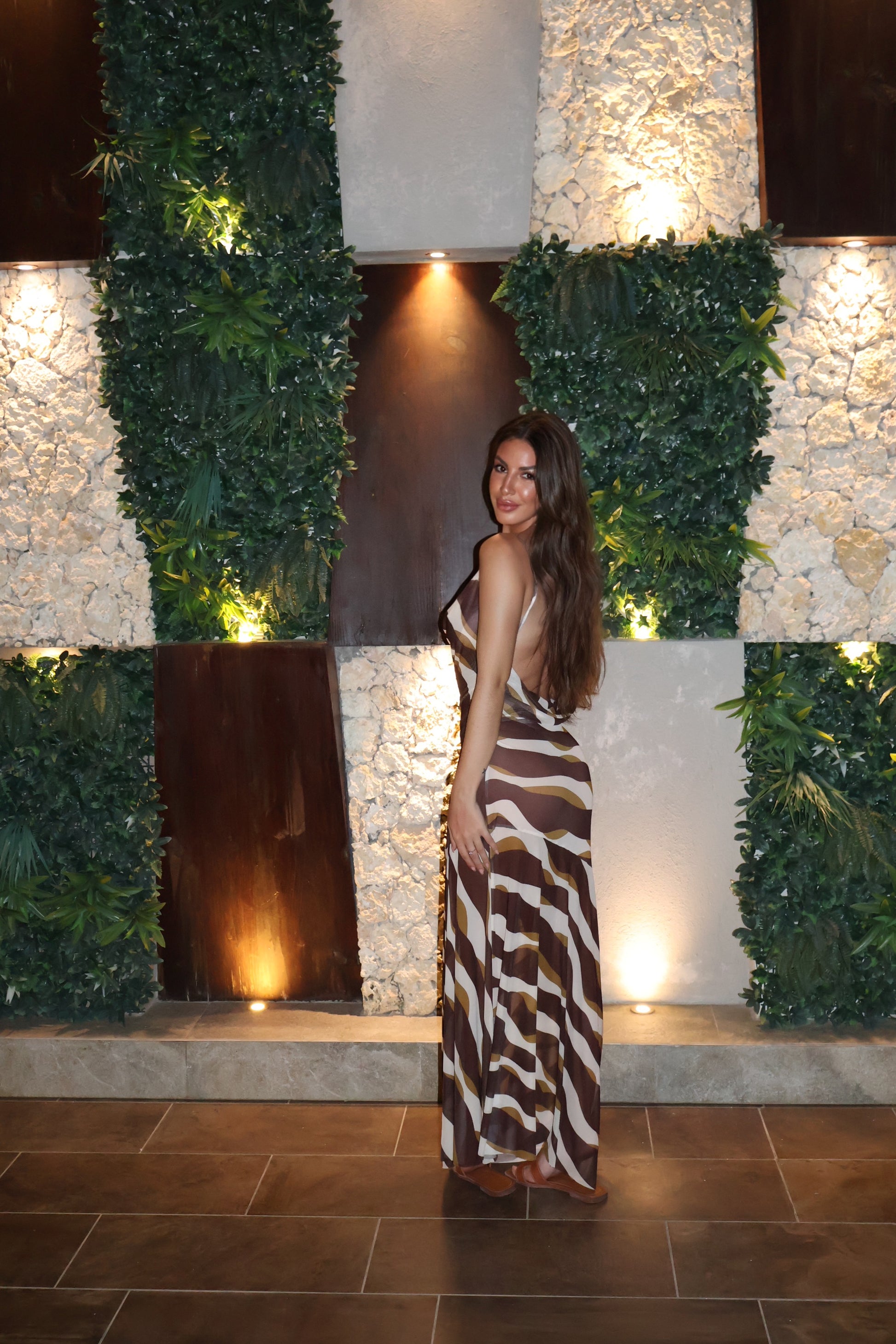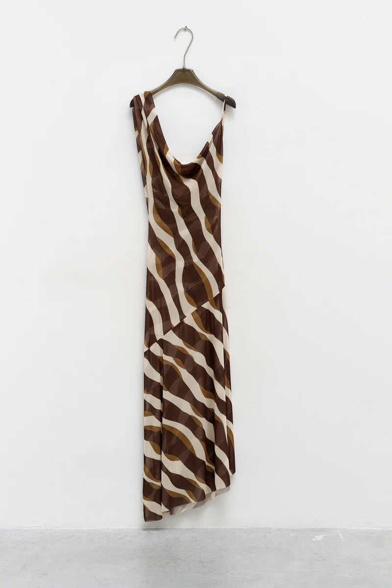 stampa ondulata nei toni caldi del cioccolato, caramello e avorio crea un raffinato gioco grafico, sofisticato e ultra contemporaneo.