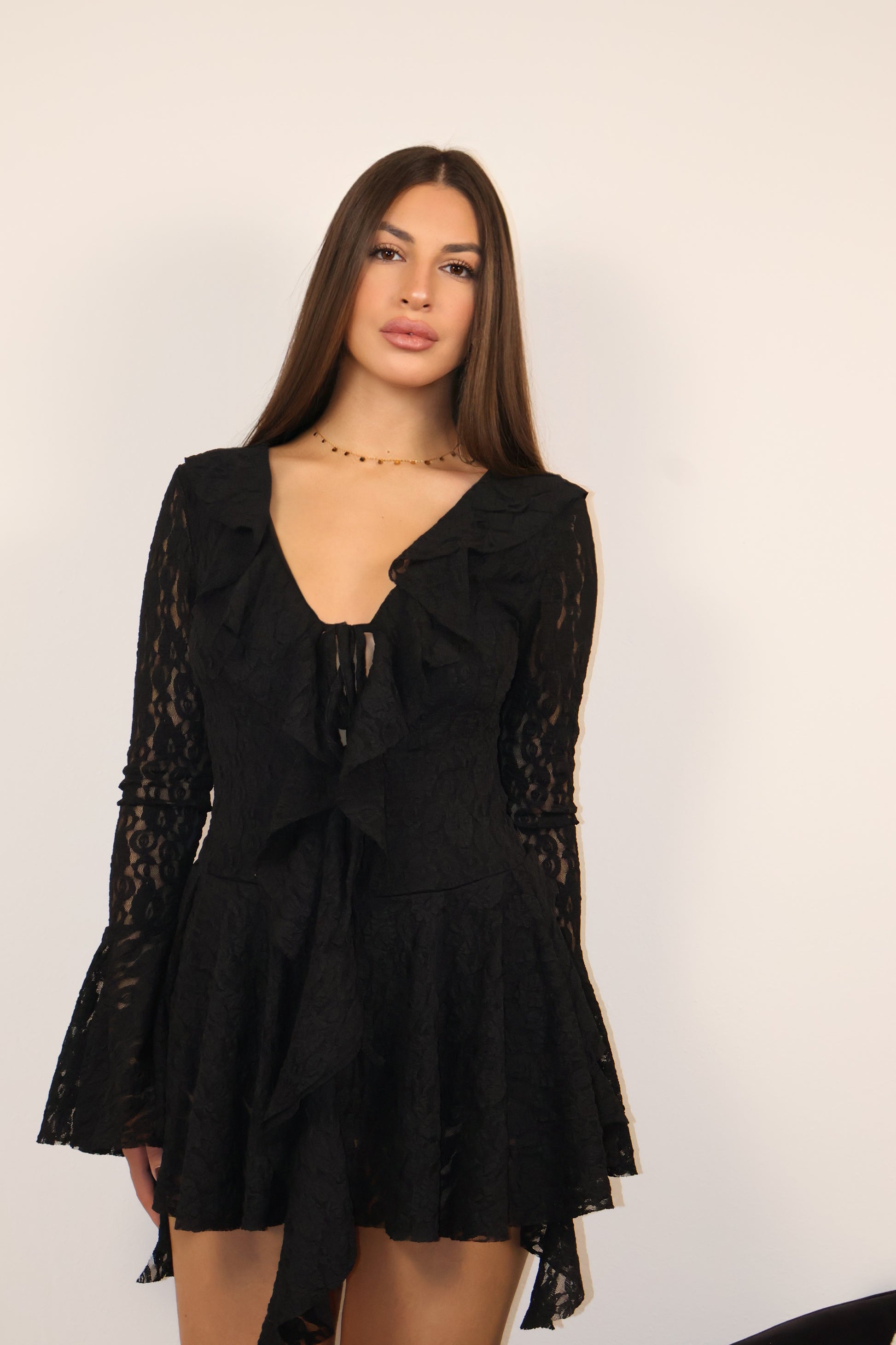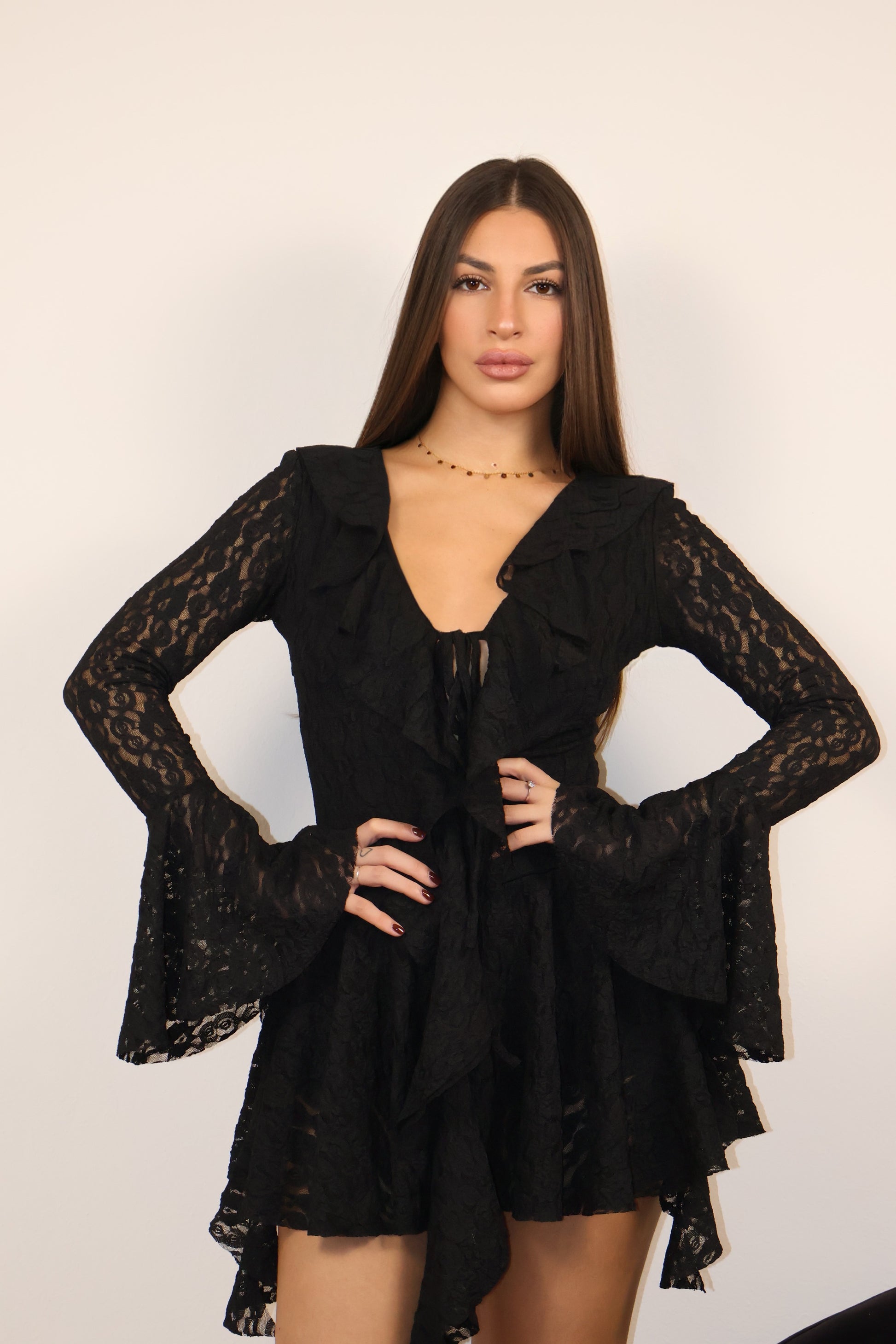 Abito Vienna, un mini dress in pizzo nero dal fascino romantico e deciso. Il suo design valorizza la silhouette grazie al corpino aderente, alle maniche svasate a campana e al fondo asimmetrico, che dona movimento e femminilità ad ogni passo.
