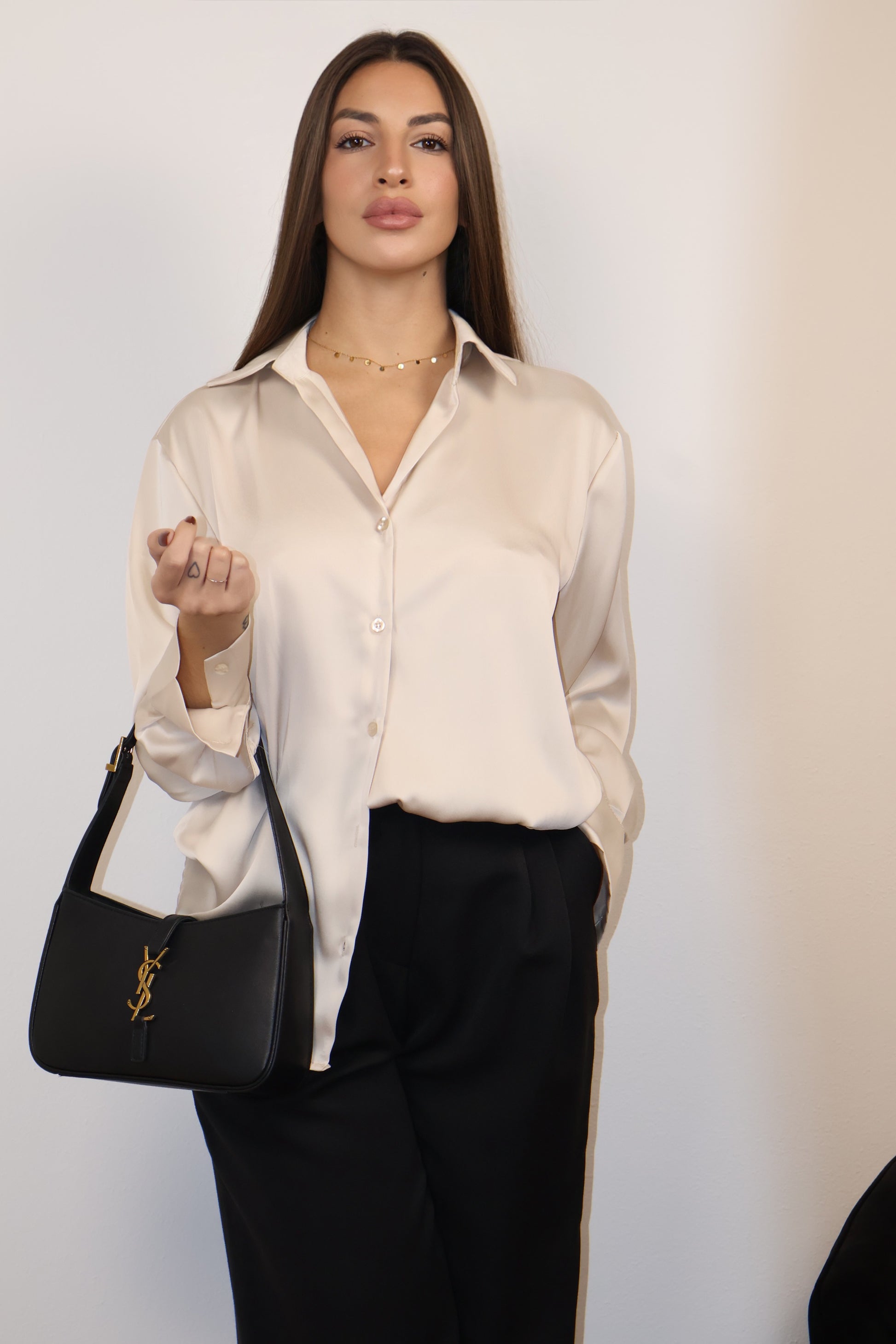 La camicia Nizza è un capo intramontabile dal fascino raffinato. Realizzata in tessuto effetto raso dal finish luminoso, dona un tocco elegante a qualsiasi look. Il taglio morbido e la linea fluida la rendono perfetta sia per outfit formali che per look più casual e contemporanei.