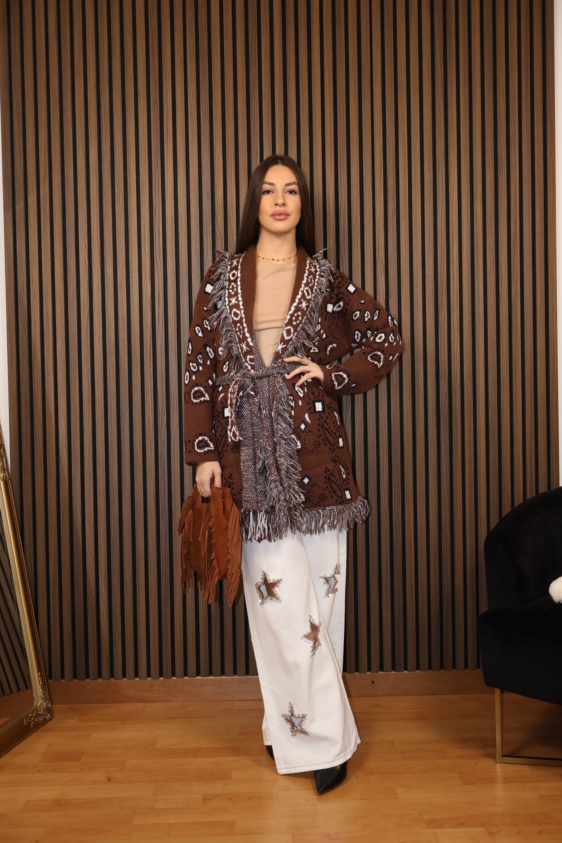 Cardigan statement dal mood boho-luxury, perfetto per elevare anche il look più semplice.