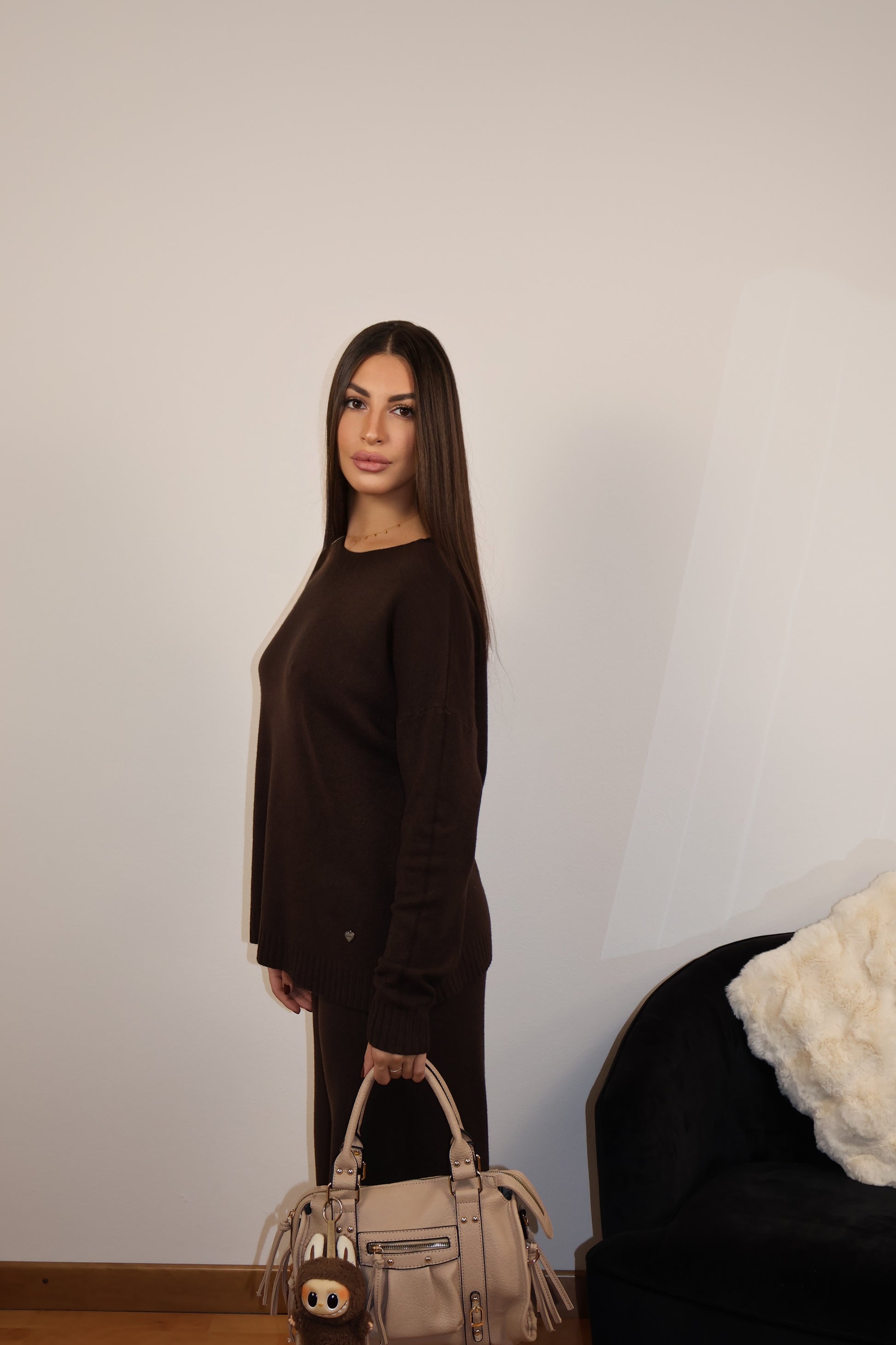 Il coordinato Nora è pensato per unire comfort, calore e stile. Realizzato in maglia morbida e avvolgente, è composto da un pullover a maniche lunghe e pantaloni a gamba dritta. Il suo tessuto caldo lo rende perfetto per la stagione fredda, mentre il colore marrone dona un tocco elegante e versatile. Ideale per un look casual chic.