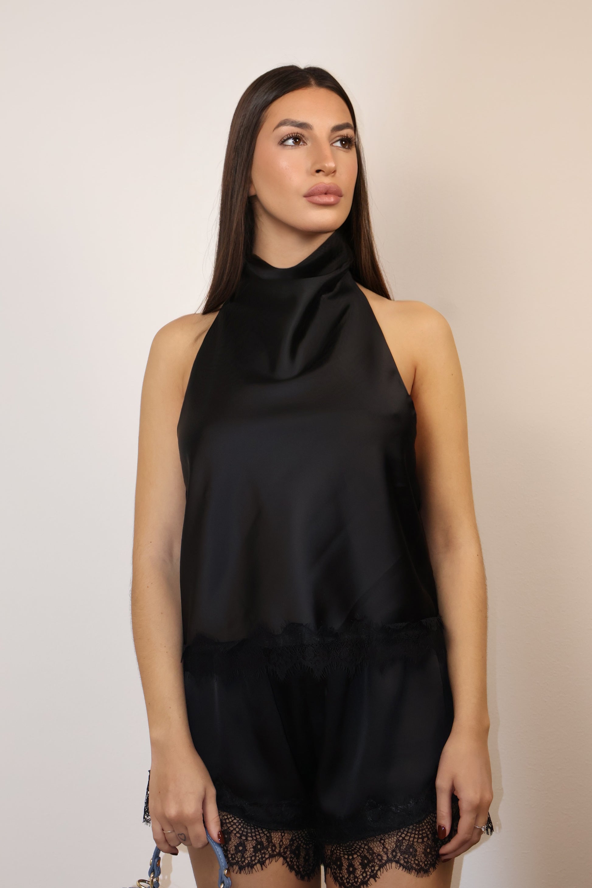 Il coordinato Parigi è un mix di eleganza e fascino moderno. Realizzato in tessuto effetto raso, è impreziosito da delicati inserti in pizzo che valorizzano le linee del corpo. Il top con collo alto e schiena scoperta aggiunge un tocco sensuale e sofisticato, mentre gli shorts coordinati completano il look con stile e leggerezza.