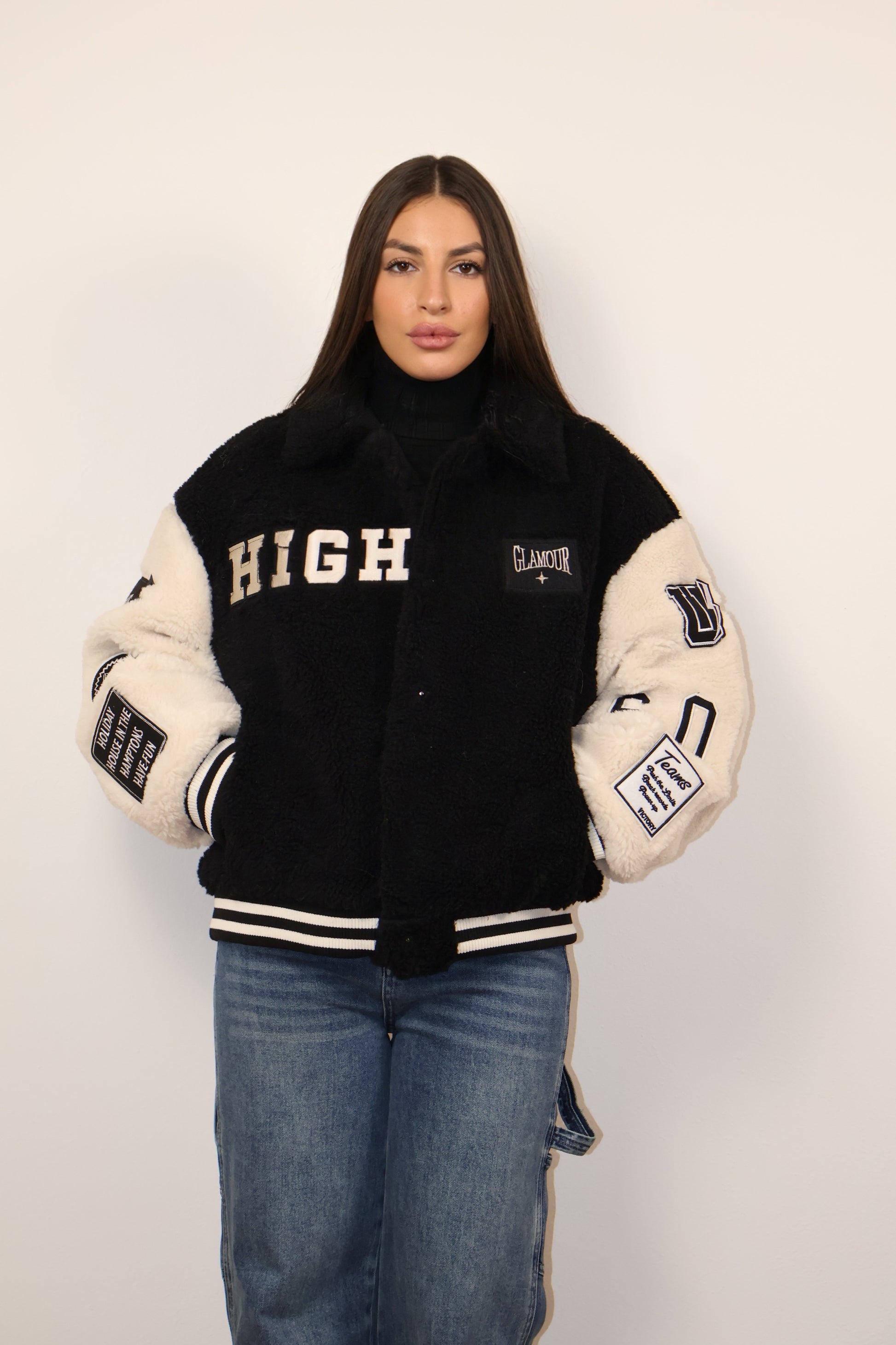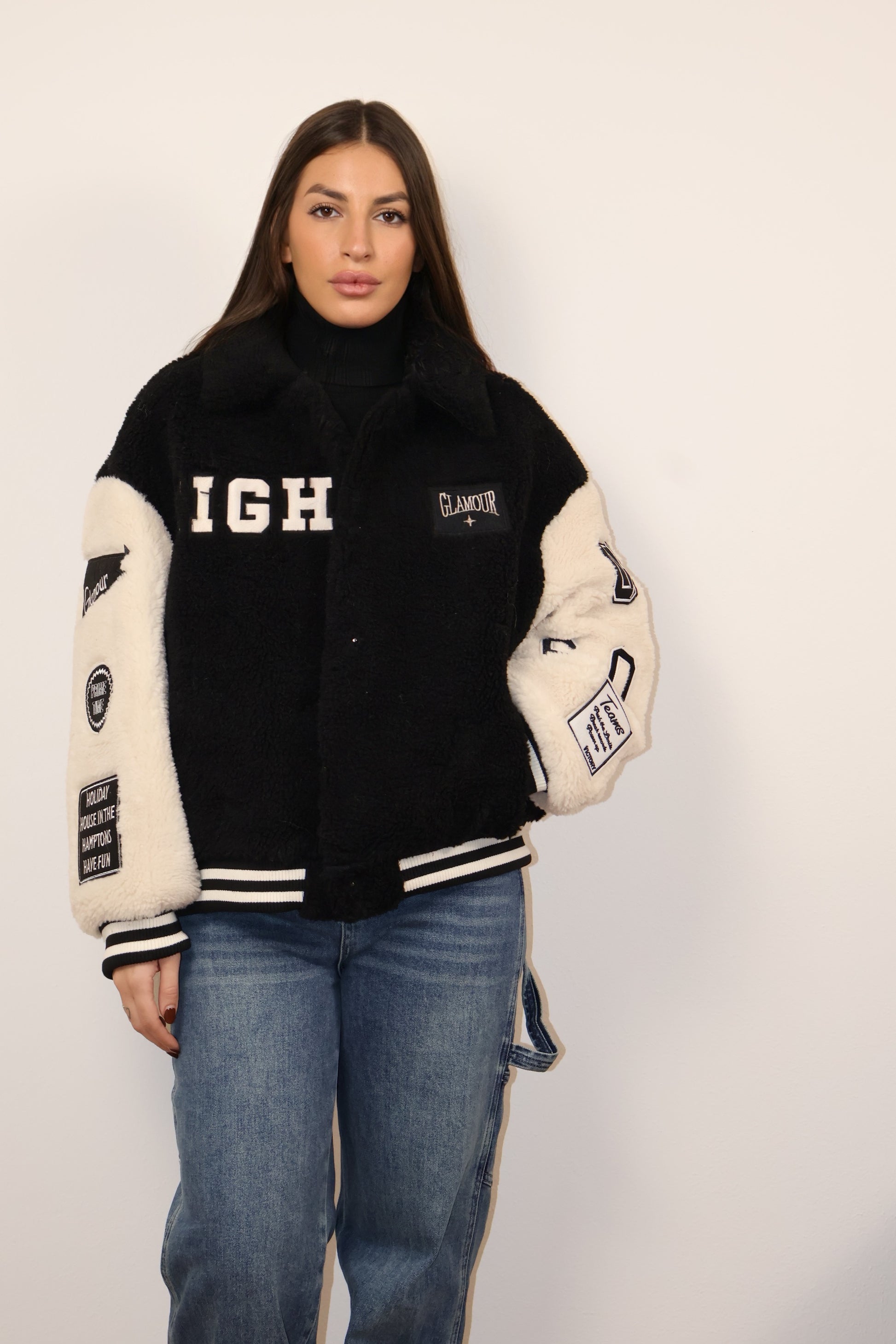 Giacca Columbia in tessuto teddy morbido e caldo, caratterizzata da un design bicolor nero e panna.