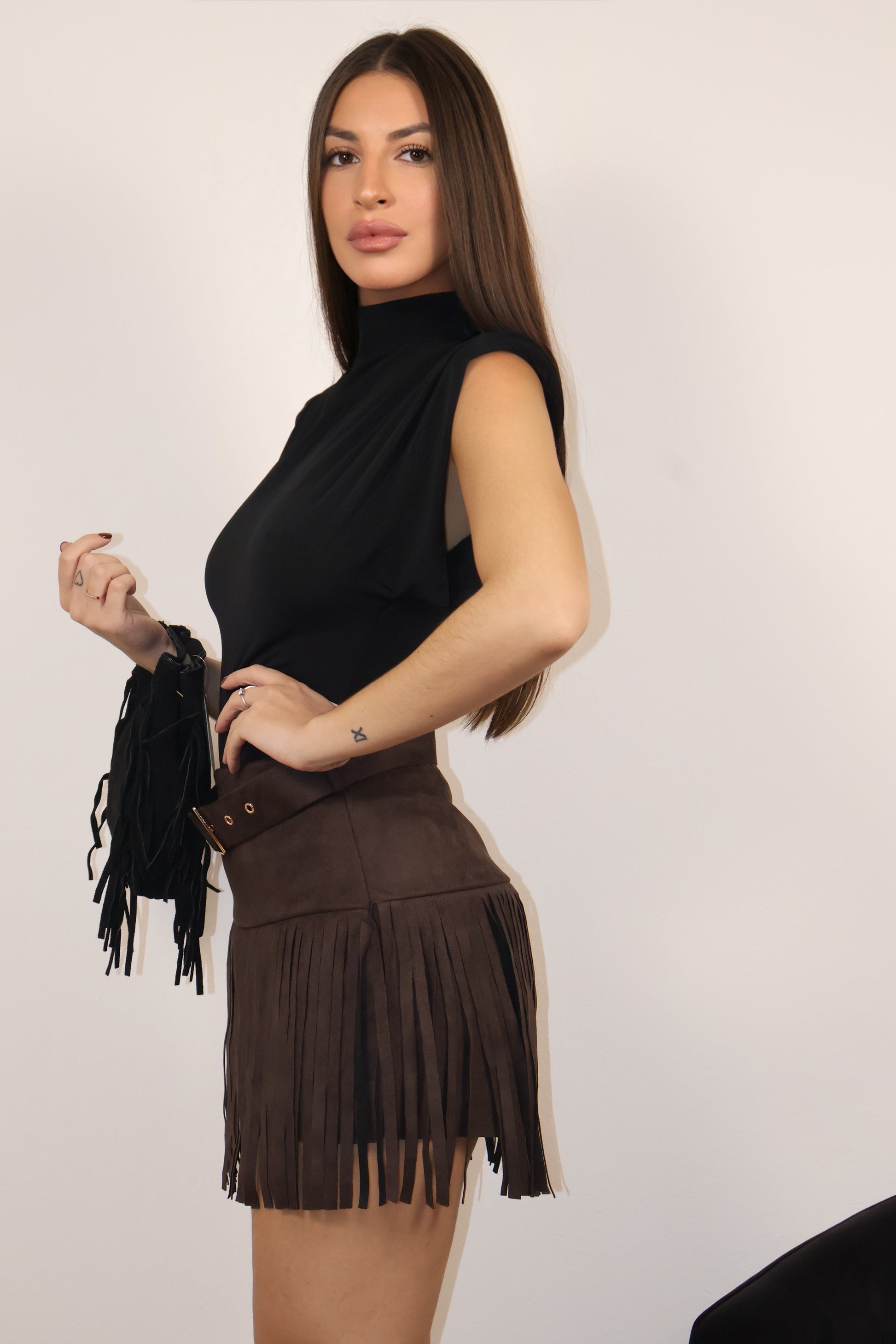 Il dettaglio protagonista sono le frange lunghe e fluide, che seguono ogni movimento e donano carattere all’outfit senza risultare eccessive.