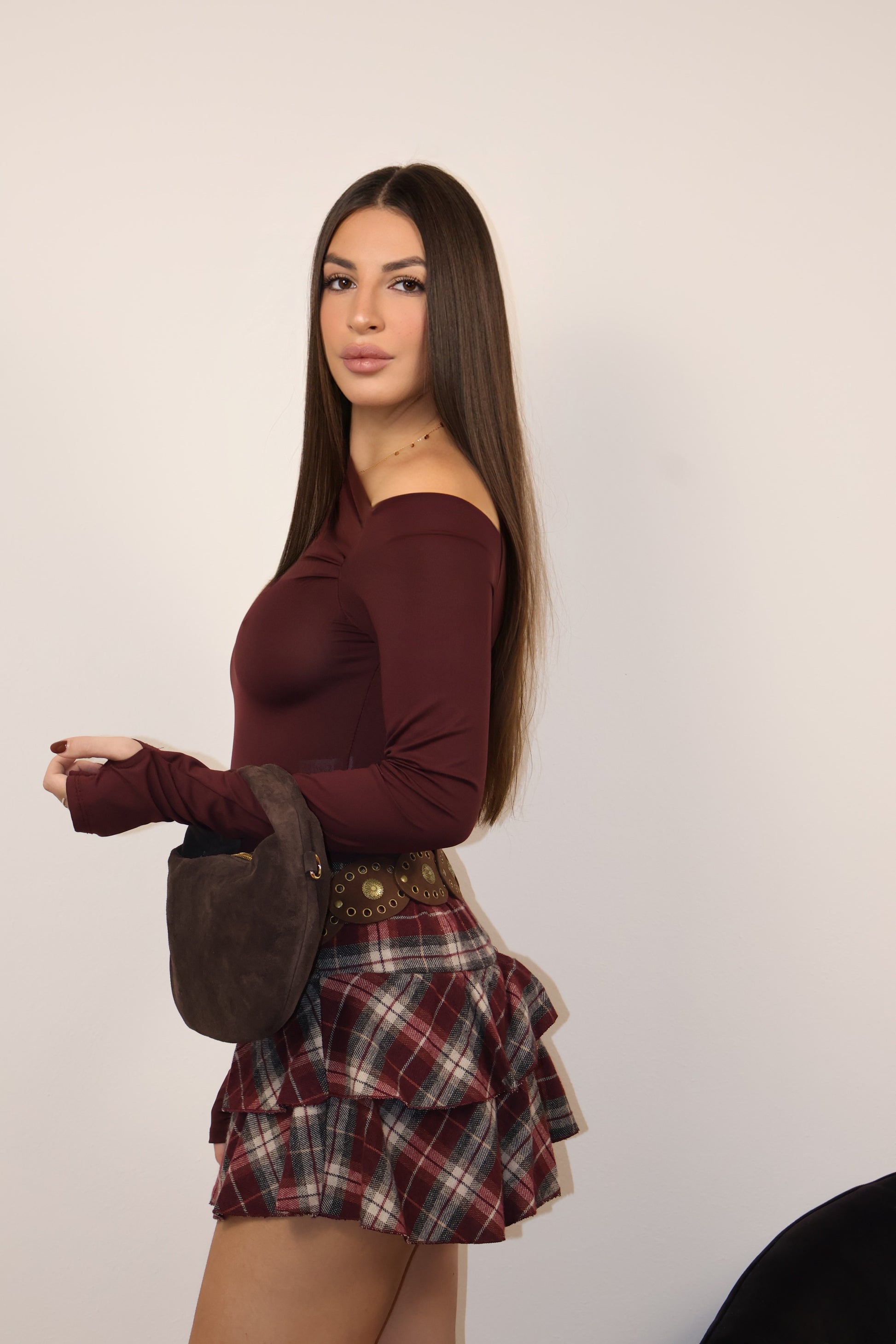 Gonna corta a balze in fantasia tartan, un modello femminile e grintoso che dona subito carattere a qualsiasi look. La struttura a più livelli crea movimento e volume, mentre la vita regolare la rende comoda e versatile. Perfetta da abbinare sia a maglioncini che a body più aderenti per un effetto super chic.
