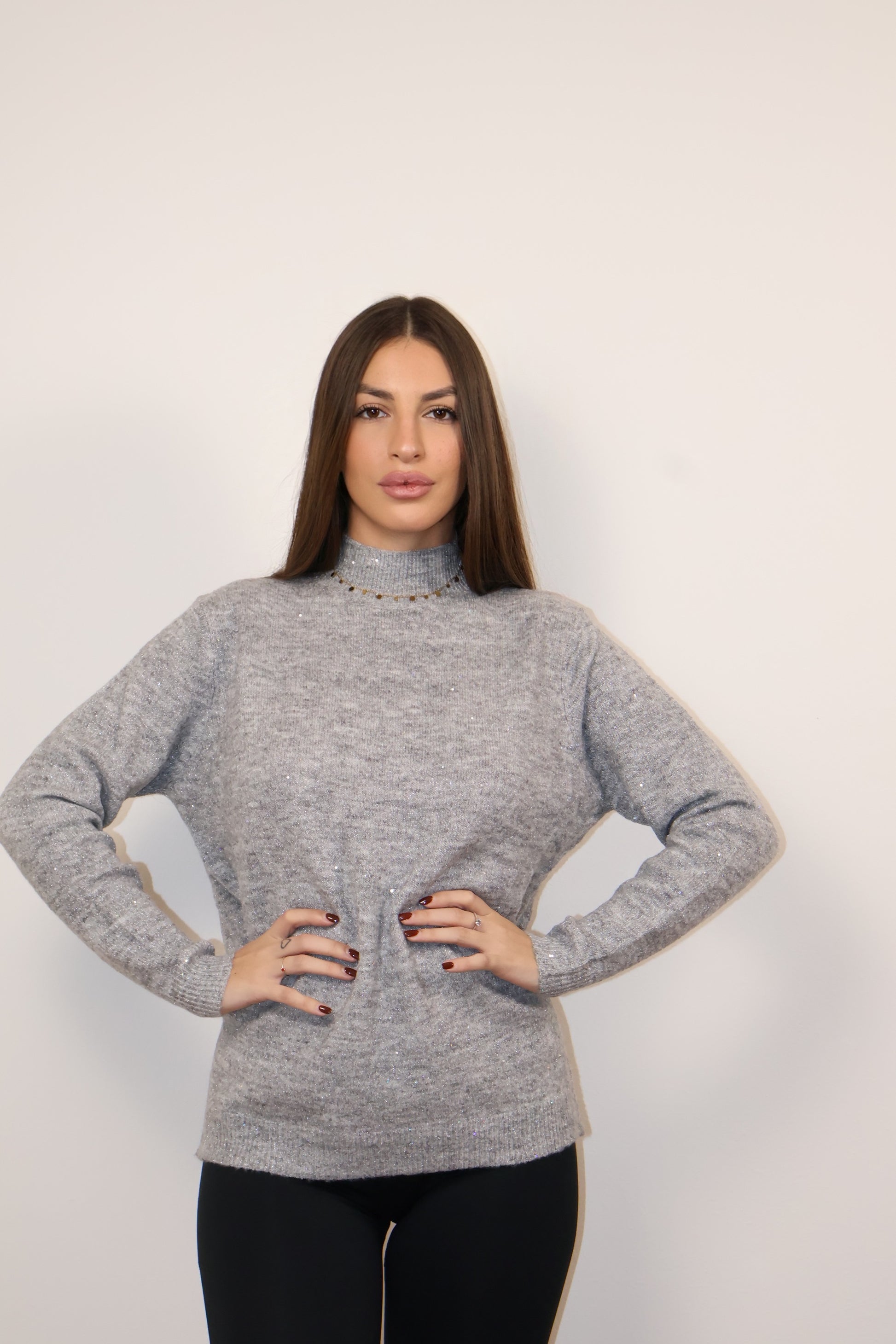 Maglione claire caldo e morbido con delicati micro-brillantini tono su tono che aggiungono un tocco luminoso senza risultare eccessivi.